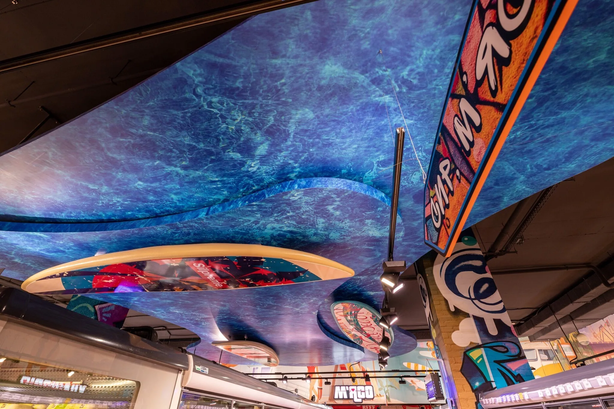 Indoors area of 925 square meters, where visitors can find an entertainment pier, roller coasters, Venetian canals, surfboards, paint cans, palm trees, sand and ocean waves on the ceiling.