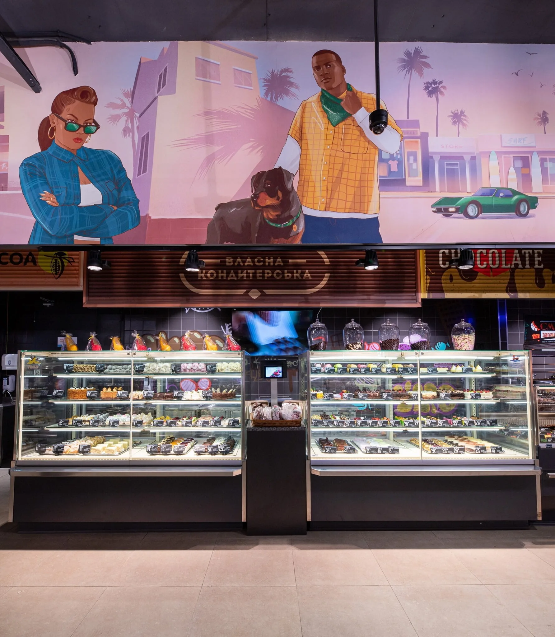 Fruits and vegetables were placed in “kiosks on wheels” – in the best beach traditions. In the murals, the designers encoded allusions to famous TV shows and a computer game from the City of Angels.